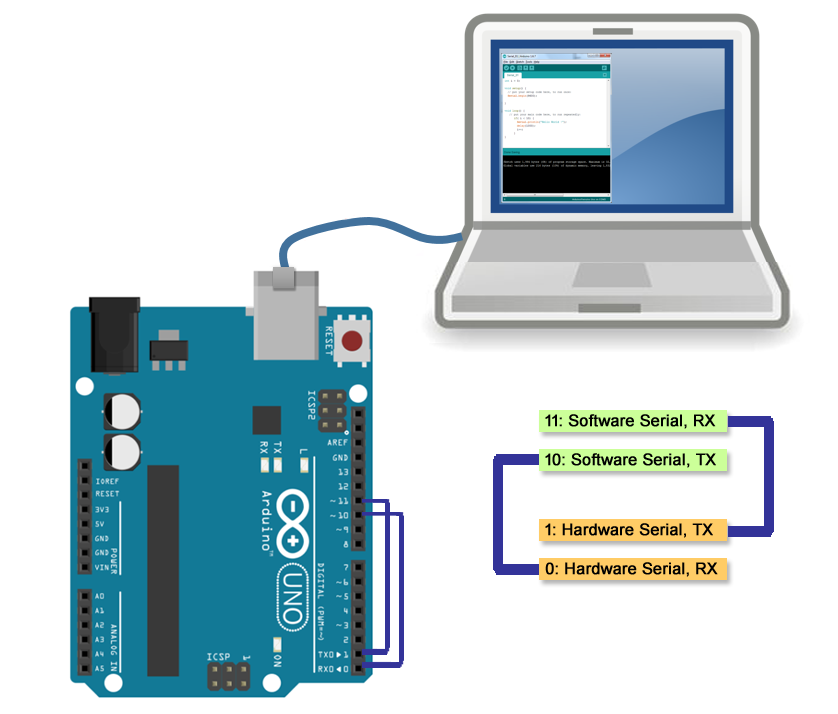 - Digital Pin 11 is used as a softSerial RX line and Pin 1 is the hardware serial TX line. Pins 1 and 11 do perform the same activities as for Pins 0 and 10.