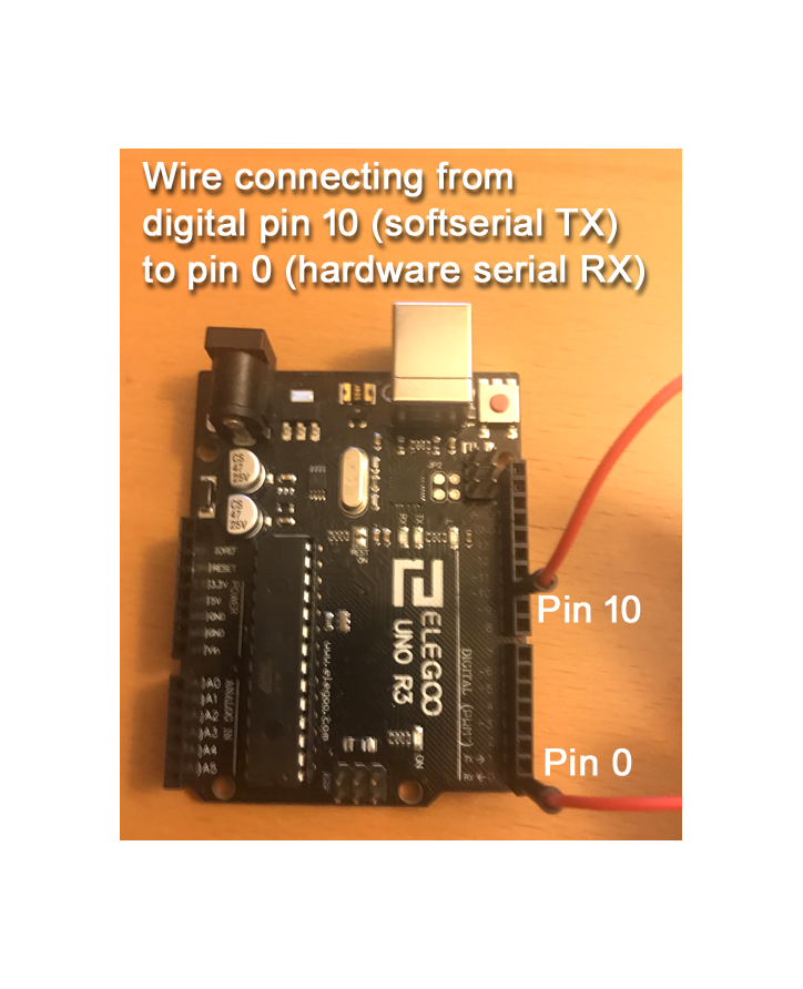 - Digital Pin 10 is used as a softSerial TX line and Pin 0 is the hardware serial RX line. Pin 0 is set set up to listen to anything coming in via the main serial line, and then echo that data out Pin 10.