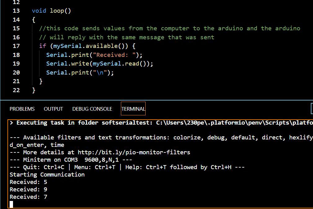 - The bottom of the screenshots show the results. Note the random numbers and letters were sent from the computer to Arduino first then got printed out from the Arduino side.
